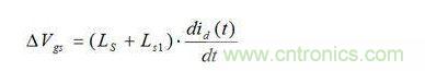 在諧振條件(ωL=1/ωC)下,柵極和源極電壓中生成的震蕩電壓遠(yuǎn)大于驅(qū)動電壓。因諧振變化而產(chǎn)生的電壓振蕩與品質(zhì)因數(shù)成正比,Q(=ωL/R=1/ωCR)。當(dāng)MOSFET關(guān)閉時,漏極寄生電感(LD+Ld1)、柵極-漏極電容Cgd和柵極引線電感Lg1網(wǎng)絡(luò)造成柵極振蕩電壓。如果柵極電阻(RG-ext.+Rg_int.)極小,則Q變大。另外,LS兩端的壓降和Ls1源極雜散電感在柵極-源極電壓中產(chǎn)生振蕩,可用表達(dá)式(1)表示。寄生振蕩可能造成柵源極擊穿、不良EMI、較大開關(guān)損耗、柵極控制失效,甚至可能造成MOSFET故障。
