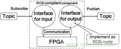 Rosbridge為ROS與FPGA的聯通提供了一種溝通機制,但是在這種機制中,ROS Node并不能運行在FPGA上,而且通過JSON API的連接機制也帶來了一定的性能損耗。為了讓FPGA與ROS更好的耦合,最近日本的研究人員提出了ROS-Compliant FPGA的設計,讓ROS Node可以直接運行在FPGA上。如圖10所示,在這個設計中,FPGA了實現一個輸入的接口,這個接口可以直接訂閱ROS的topic,使數據可以無縫連接流入FPGA計算單元中。另外,FPGA上也實現了一個輸出接口, 讓FPGA上的ROS Node可以直接發表數據,讓訂閱這個topic的其他ROS Node可以直接使用FPGA產出的數據。在這個設計中,開發者只要把自己開發的FPGA計算器插入到ROS-compliant的FPGA框架中,便可以無縫連接其他ROS Node。