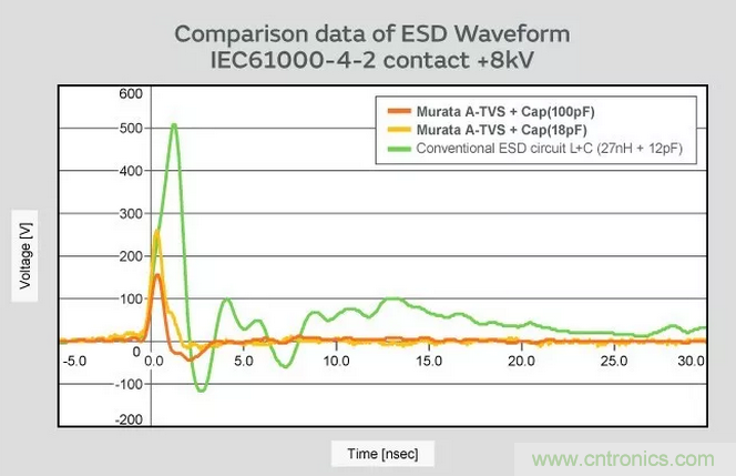 A-TVS和電容器組合,比較電感器和電容器組合的ESD保護性能。A-TVS和電容器的組合可更有效地抑制ESD。