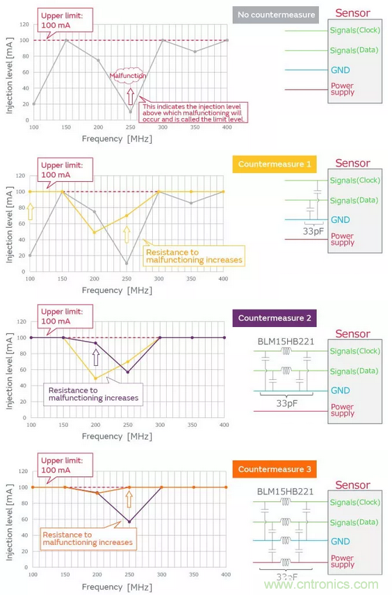 傳感器的信號線收到噪聲影響,傳感器的通信會發生停止。提高注入的噪聲水平,調查能夠正常工作(不發生誤操作)的水平極限。