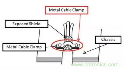 一個好的電磁干擾屏蔽是通過一個完整的360°外殼周圍的保護裝置來完成。完整的360°屏蔽是環繞整個受保護設備(例如電纜)并將其連接到底盤(見圖1)的環向終止端子上。