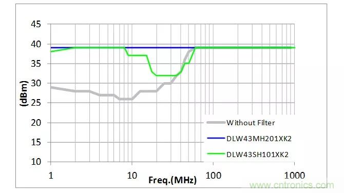 【導讀】支持CAN、FlexRay的DLW43SH101XK2在有些頻率下噪聲會增加,降噪效果不佳,但使用支持100Base-T1的DLW43MH201XK2能有效地降噪。