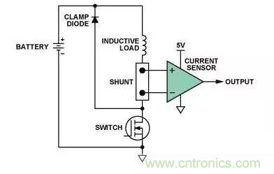 本例將詳細(xì)介紹一種典型的高端電流檢測(cè)應(yīng)用。圖1所示為汽車應(yīng)用環(huán)境中用于監(jiān)控電磁閥或其它感性負(fù)載的常見配置。