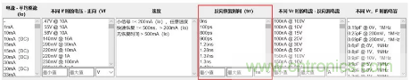 Digi-Key官網上,肖特基二極管選型列表中,提供“反向恢復時間”欄。為了減少額外的電磁干擾,反向恢復時間越小越好。