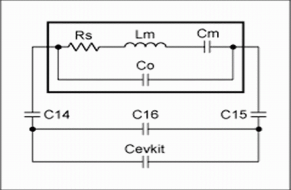 圖3給出MAX1470評估板電路里的晶體圖。在這個電路中,C14和C15是串聯牽引電容,而C16是并聯牽引電容。Cevkit為等效的MAX1470芯片加上評估PCB的寄生電容。Cevkit約為5pF。