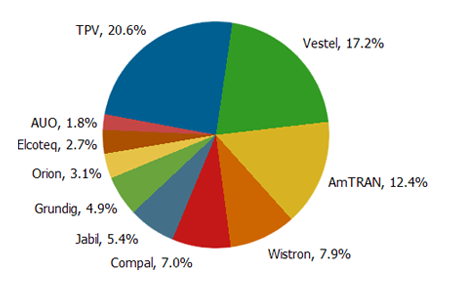 從代工廠商排名來看,TPV主要客戶有Vizio、AOC以及Philips,第一季市占率為20.6%排名居首;Vestel以17.2%市占率居次,而其主要生產供貨給自有品牌、白牌業者以及賣場品牌機種;第三名代工廠商為AmTRAN,第一季市占率12.4%,該公司主要客戶為Vizio。同時隨著中國液晶電視出貨對全球液晶電視市場日益重要,以及國內品牌廠商市占率超過海外品牌廠商,DisplaySearch在每季度報告中均包括有中國電視廠商供應鏈的詳細分析,對關心中國市場的客戶是一份相當值得參考的資料。