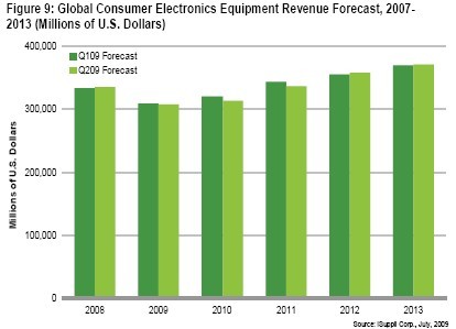 預計全球消費電子營收仍將下降8.2%,從2008年的3,350億美元下降到約3,080億美元。但iSuppli估計2010年市場將開始復蘇,營收將增長2%,達到3,140億美元。預計未來五年將實現持續增長,到2013年達到3,700億美元。