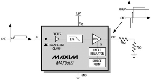 當視頻濾波放大器采用1.8V電源電壓工作時,必須采用DirectDrive技術(shù)。采用電壓模式輸出級的放大器必須至少提供2VP-P擺幅,才能輸出復(fù)合視頻信號。傳統(tǒng)的放大器采用1.8V單電源供電時,沒有足夠的余量產(chǎn)生2VP-P輸出信號。而采用DirectDrive后,集成反向電荷泵將產(chǎn)生一個嘈雜的-1.8V電壓;負電壓線性穩(wěn)壓器將-1.8V電壓穩(wěn)定到-1V,降低了電荷泵噪聲。因此,實際采用-1V~+1.8V的電壓供電時,MAX9509剛好有足夠的余量輸出2VP-P視頻信號。