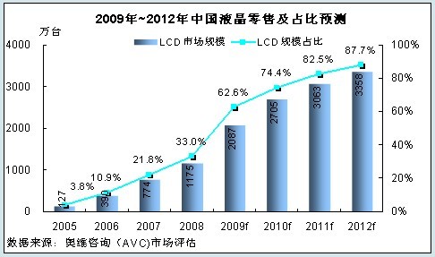 受上半年經濟形勢低迷以及產品替代影響,即使在家電下鄉、節能補貼、以舊換新三大政策刺激下,2009年全年彩電市場零售量規模將較2008年下降6.5%。但對于液晶電視來說,則得益于三大政策的刺激,繼續保持高速增長,預計全年LCD電視市場國內零售量規模近2100萬臺,出貨規模可達2400萬臺,LCD電視市場將占總體市場比達到62.6%。