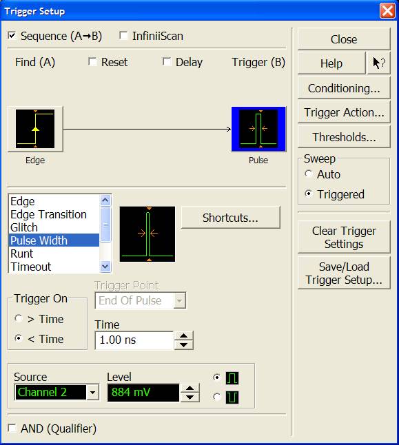 相反,我們所說的“脈沖”觸發只有等到第二個跳變出現后才會進行觸發。也就是說,對于正脈沖來說,即使超過最大時間,也要一直等到下降沿才會發生觸發。這意味著時間限制點之后的觸發可以良好地進行。因此,超時觸發的使用率比脈寬觸發高得多。由于這并不直觀,所以我們為用戶提供了兩種選擇,用戶可以使用超時觸發,也可以使用脈沖末端觸發。如果選擇超時選項,則此時的脈寬觸發將與超時觸發完全相同。