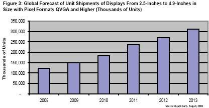 - 2.5英寸~4.9英寸、像素格式為QVGA 及更高的手機LCD顯示屏的出貨量2009年將增加到1.499億臺