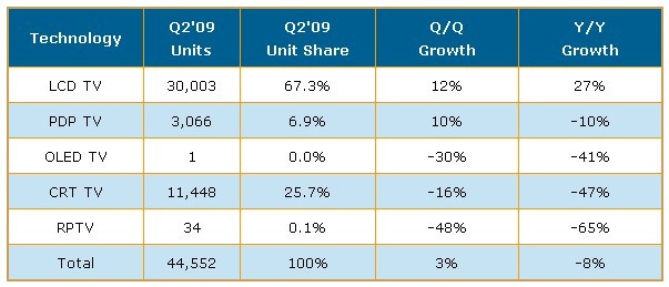 - 2009年第二季全球出貨全球電視機出貨量為4千460萬臺,較去年同期下滑8%