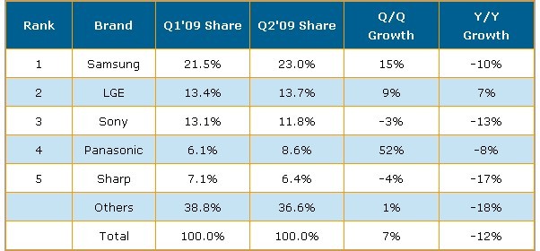 以品牌排名來看,Samsung維持全球第一地位同時已連續14個季度稱王,第二季出貨金額市占率達23%,出貨量則創18.2%歷史新高紀錄。LGE出貨金額市占率達13.7%居第二名,無論是LCD TV或是等離子電視出貨市占率均有增長,同時抵銷了CRT TV的下滑部份。Sony 市占率僅達11.8%,第二季全球排名第三。