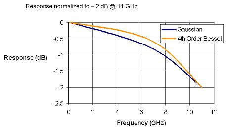 Gaussian響應(yīng)在-3dB之后仍衰減很慢。其優(yōu)點(diǎn)是允許被測(cè)信號(hào)的更高頻率成分的諧波能量通過(guò)放大器(這是假定其有采樣率遠(yuǎn)超過(guò)Nyquist),對(duì)于特別快的快沿測(cè)量有幫助。其缺點(diǎn)是在低頻段使被測(cè)信號(hào)嚴(yán)重衰減,特別是對(duì)3次諧波的衰減嚴(yán)重,導(dǎo)致眼圖測(cè)量中產(chǎn)生"花生眼"。