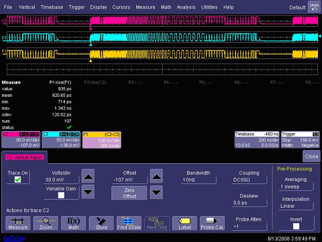 我們知道,帶寬的限制對(duì)信號(hào)的捕獲會(huì)帶來(lái)下面的影響:1,使被測(cè)信號(hào)的上升沿變緩。2,使信號(hào)的頻率分量減少。3,使信號(hào)的相位失真。 那么,“對(duì)于5MHz的時(shí)鐘信號(hào),需要用多少帶寬的示波器來(lái)測(cè)量?” 這是我在培訓(xùn)時(shí)常問(wèn)的一個(gè)問(wèn)題。我很少能得到令我滿(mǎn)意的答案,很少有工程師反問(wèn)我:“這5MHz的時(shí)鐘信號(hào)是方波還是正弦波,如果是方波,其上升時(shí)間是多少?” 我常得到的回答是,“100MHz帶寬就足夠了,示波器帶寬通常是被測(cè)信號(hào)頻率的3-5倍,100MHz余量很大了。” 圖13顯示了5MHz的方波信號(hào)在不同帶寬時(shí)測(cè)試出的波形。其中,M1和M2是分別在6GHz和1GHz時(shí)波形,C3是帶寬限制到200MHz的測(cè)試結(jié)果。 圖14顯示在帶寬限制到200MHz時(shí)測(cè)量出的5MHz的上升時(shí)間均值為本1.70357ns,而圖15顯示的是在6GHz帶寬時(shí)的上升時(shí)間為873.87ps。這表明,對(duì)于 5MHz的時(shí)鐘,因?yàn)槠渖仙龝r(shí)間比較快,最好用1GHz以上帶寬的示波器來(lái)測(cè)量其上升時(shí)間,200MHz時(shí)其上升沿變緩; 1GHz帶寬和6GHz帶寬對(duì)于測(cè)試800ps的上升時(shí)間結(jié)果幾乎一樣。