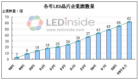 據LED產業研究機構LEDinside統計,中國大陸LED芯片生產企業數量近幾年呈快速上漲的勢頭,至2009年8月現存LED芯片生產企業達62個。至2009年8月中國大陸已經有15個省/直轄市進入LED芯片行業,廣東、福建企業數量明顯領先于其他地區,廣東有10個占16.1%,福建有8個占 12.9%。7個國個半導體照明產業化基地所在的省/直轄市,LED芯片企業數量都在4個或以上。