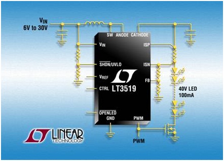 LT3519 在 LED 的高端檢測輸出電流,從而可實(shí)現(xiàn)降壓、降壓-升壓或升壓型配置。結(jié)合傳統(tǒng)電壓反饋和獨(dú)特的浮動電流檢測反饋,這些轉(zhuǎn)換器可以作為恒定電壓或恒定電流源工作,從而提供最大的設(shè)計(jì)靈活性。其它特點(diǎn)包括:開路 LED 保護(hù)、軟啟動和熱保護(hù)。