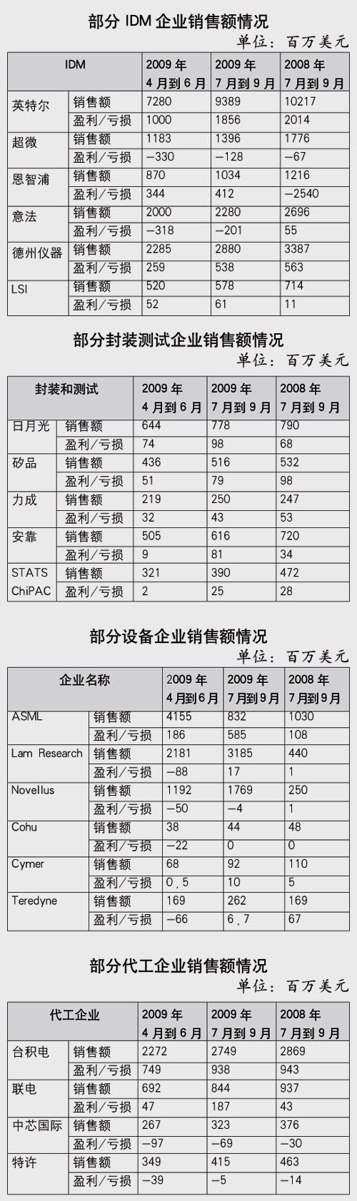 國際金融危機重創(chuàng)半導體業(yè)。今年第一季度企業(yè)產(chǎn)能利用率普遍在50%以下。進入第二季度后,我們看到部分企業(yè)業(yè)務止跌回升。近日,企業(yè)第三季度財報紛紛出籠,產(chǎn)業(yè)好轉(zhuǎn)趨勢進一步明朗化。但由于企業(yè)上升動力不足,產(chǎn)業(yè)出現(xiàn)“V型”反彈的可能性不大,應該會在振蕩中上升。與此同時,今年半導體業(yè)銷售額同比下降約15%的狀況已確定無疑。業(yè)內(nèi)目前關(guān)注明年產(chǎn)業(yè)上升的幅度。