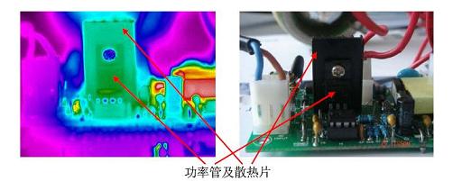 大的器件,所以必須加裝散熱片使其長期穩定工作溫度不超過120℃;在拍攝熱圖時,散熱片是鋁合金材料經過發黑處理,其表面雖然為黑色但其發射率還是較低,建議用油漆筆涂黑后進行檢測,或在溫度穩定一段時間后直接測量功率管的溫度。