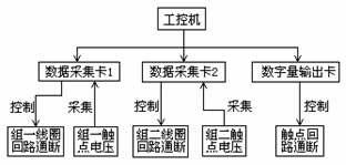 需要注意的是,當(dāng)觸點電壓為交流信號時,為了保證電壓有效值的計算精度,采集卡在一個工頻周期內(nèi)要完成16個采集通道至少320次的AD轉(zhuǎn)換,這就要求采集卡的采集速率非常快,本裝置采用的是研華的PCL-818HG。每塊采集卡還提供了一個20-PIN數(shù)字輸出口,用來控制試品線圈回路的通斷電。試品觸點回路采用一塊多通道的數(shù)字量輸出卡,通過固態(tài)繼電器實現(xiàn)對兩組試品觸點回路的通斷電控制。繼電器可靠性檢測裝置的結(jié)構(gòu)框圖如圖1所示。