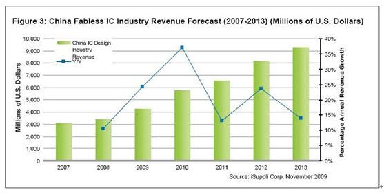 圖3 所示為iSuppli 公司對中國無晶圓廠IC 市場營業(yè)收入的預(yù)測。