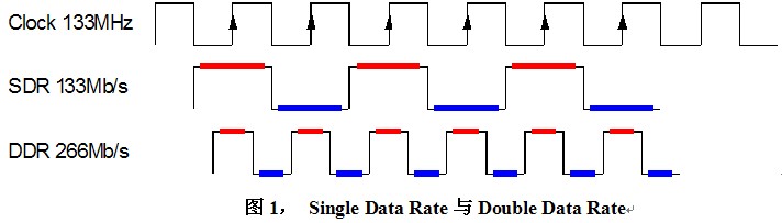 內存技術從SDR,DDR,DDR2,DDR3一路發(fā)展而來,傳輸速度以指數遞增,除了晶圓制造工藝的提升因素之外,還因為采用了Double Data Rate以及Prefetch兩項技術。實際上,無論是SDR還是DDR或DDR2、3,內存芯片內部的核心時鐘基本上是保持一致的,都是100MHz到200MHz(某些廠商生產的超頻內存除外)。DDR即Double Data Rate技術使數據傳輸速度較SDR提升了一倍。如下圖所示,SDR僅在時鐘的上升沿傳輸數據,而DDR在時鐘信號上、下沿同時傳輸數據。例如同為133MHz時鐘,DDR卻可以達到266Mb/s的數傳速度。