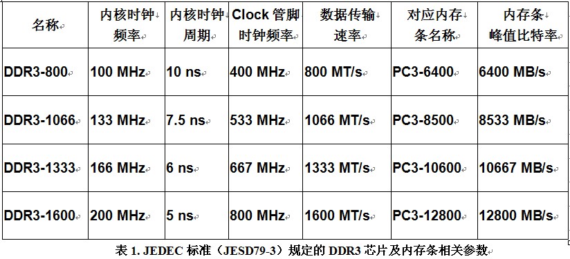 下表列出了JEDEC標準(JESD79-3)規(guī)定的DDR3芯片及內存條相關參數。需要說明的是,如前所述,并不是所有的內存產品都完全遵從JEDEC標準,有些廠商會生產速度更高速的DDR3芯片,一般情況下這些芯片是從芯片檢測流程中篩選出來的頻率動態(tài)范圍更大的芯片,或者是可加壓超頻工作的芯片。
