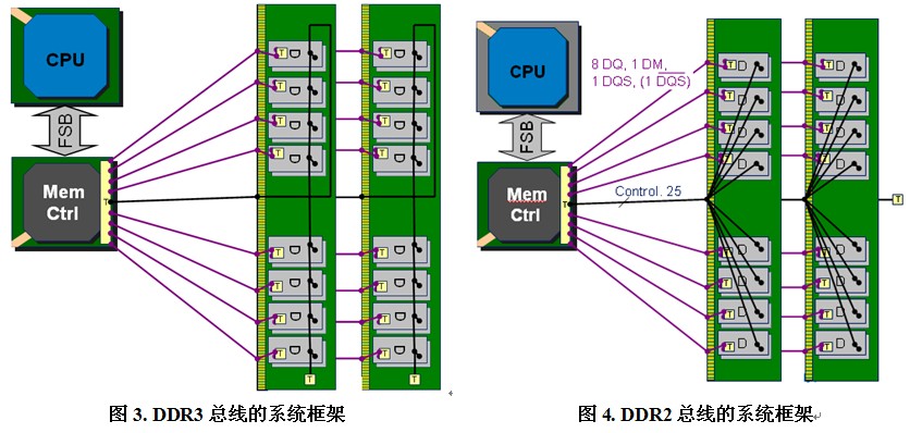 在系統(tǒng)設計方面DDR3與DDR2最大的區(qū)別在于DDR3將時鐘、地址及控制信號線的終端電阻從計算機主板移至內存條上,這樣一來在主板上將不需要任何端接電阻。為了盡可能減小信號反射,在內存條上包括時鐘線在內的所有控制線均采用Fly-by拓撲結構。同時,也是因為Fly-by的走線結構致使控制信號線到達每顆內存顆粒的長度不同從而導致信號到達時間不一致。這種情況將會影響內存的讀寫過程,例如在讀操作時,由于從內存控制器發(fā)出的讀命令傳送到每顆內存芯片的時間點不同,將導致每顆內存芯片在不同的時間向控制器發(fā)送數據。為了消除這種影響,需要在對內存進行讀寫等操作時對時間做補償,這部分工作將由內存控制器完成。DDR3總線的系統(tǒng)框架如下圖所示,其中紅線代表DQ、DM以及差分DQS信號線,黑線代表時鐘、地址及控制信號線,T代表相應的端接電阻。