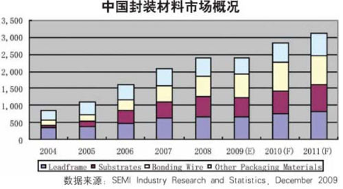 - 中國(guó)的半導(dǎo)體封裝材料市場(chǎng)在2009年將超過(guò)22億美元,比2008年增加1%左右