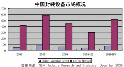 中國(guó)的封裝設(shè)備市場(chǎng)在2008年達(dá)到4.52億美元。受經(jīng)濟(jì)危機(jī)影響,中國(guó)封裝設(shè)備市場(chǎng)在2009年預(yù)計(jì)下滑34%左右,為3億美元。隨著中國(guó)封裝設(shè)備市場(chǎng)的快速成長(zhǎng),部分領(lǐng)先的設(shè)備商在中國(guó)設(shè)立了生產(chǎn)線(xiàn)。然而本土封裝設(shè)備占中國(guó)市場(chǎng)份額不足15%且主要應(yīng)用于低端市場(chǎng)。