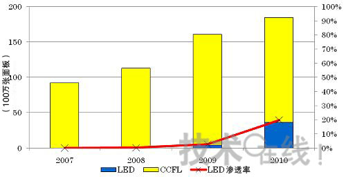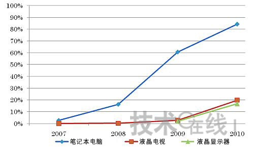 筆記本電腦面板配備LED背照燈早于液晶電視面板,于2007年就全面開(kāi)始了。2009年的LED背照燈配備比例達(dá)到了60%以上。預(yù)計(jì)2010年開(kāi)始將全面向LED背照燈時(shí)代過(guò)渡。在2010年配備比例將達(dá)到80%以上,2012年之前將全面改用LED背照燈。