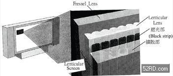 事實上早期的MD方式RP-TV都是使用CRT背投電視螢幕,因此始終無法充分發揮MD方式RP-TV的特性,有監于此日本凸版印刷公司首度開發如(圖五)所示MD方式RP-TV專用螢幕,由圖可知MD方式RP-TV專用螢幕的LenticularLens與遮光部各自獨立設置,尤其是遮光部設于擴散部后面革命性設計,使得該MD方式RP-TV專用螢幕可以具備極佳的光學特性。