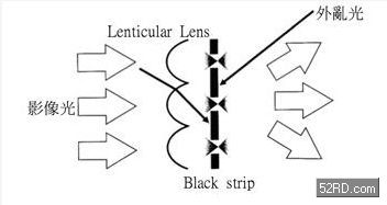 如(圖二)所示從LenticularLens入射影像光線在鏡片焦點附近集光,由于遮光部的開口設于各鏡片的集光位置,因此影像光線在遮光部不會被遮蔽可以順利穿透螢幕,行進方向未定的外亂光線則被遮光部吸收,由此可知RP-TV用螢幕是利用鏡片與遮光部的特性,達成影像光線穿透外亂光被吸收的目的。
