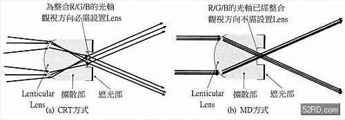 (圖四)(a)是傳統CRT背投電視螢幕的動作特性圖,由圖可知RGB各影像光線分別從相異方向投射到螢幕,當影像光線從螢幕出射時必需進行光線整合,因此觀視方向的螢幕表面通常會設置LenticularLens;圖四(b)是MD方式背投電視螢幕的動作特性圖,由圖可知它使用MD方式投影機投射影像,所以觀視方向的螢幕表面不需設置LenticularLens。