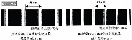 如上所述RP-TV用螢幕通常是在明亮室內環境中使用,對RP-TV螢幕而言阻斷室內外亂光提高影像對比(Contrast)非常重要。影像光線穿透時不會被遮光部遮蔽的前提下,通常開口部的面積越小,亦即遮光部的面積比率越大,遮蔽外亂光的能力越強,影像對比也越高。