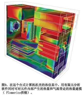 美國國家半導體的Webench在線設計工具采用Flomerics的Flotherm熱分析軟件,計算靜止空氣中的器件溫度。所有一般的仿真注意事項均適用。如果你的電路有風扇和一些氣流,其溫升就較低。如果有機箱,里面還有其它器件,其溫升就高。Flomerics采用有限元方案技術(參考文獻5)。圖9顯示了一個計算機機殼發熱與氣流的分析結果。很多其它有限元解算器也可以分析這種問題。例如,Comsol的一個解算器可以完成多重物理分析,可以解算超過一個問題的偏微分方程,如一只部件的熱響應,部件的導熱性能隨其溫度而變化。TI的Edwards指出,他的公司提供二種級別的熱建模抽象:ΦJB熱阻,以及Delphi緊湊模型標準。Flotherm、Icepak和很多其它熱分析程序都使用這些模型。