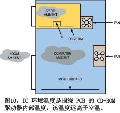 無疑,當大多數工程師沒有理解環境溫度的嵌套程度時,他們就會失敗。例如,假設要設計一個部件,用于CD播放機的光學拾取裝置(圖10)。你可能會這么假設,由于該部件用于消費產品,它可能工作在0℃~70℃。但好好想想吧。實驗室工作臺上的部件可能是工作在25℃環境下。而光功率件是要安裝在CD驅動器里,驅動器中有其它元件在加熱空氣,該裝置可能不裝風扇。更糟糕的是,播放機裝在計算機內,驅動器必須工作在這種環境溫度下。計算機內部有自己的熱源和風扇,這個溫度上再加上外部環境溫度,因此,在工作臺上測得的25℃室溫,到了計算機內就是40℃,CD驅動器內是50℃。現在,如果你把計算機放在厄瓜多爾的一個很熱的閣樓上,情況又該如何?這個部件必須工作在遠高于70℃的環境溫度下。你的職責是確保它仍能滿足規范,并且高溫不會顯著縮短產品的壽命。