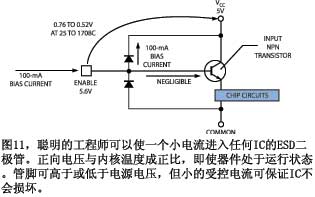 同樣,如果多余管腳是片選腳,它必須在IC工作時保持為低電平,則可以將該腳拉低到接地腳,并從ESD二極管獲得數據。如果該腳是輸出腳,則要與制造商聯絡,以確認沒有外部電流會妨礙全部100mA電流穿過二極管。你必須對每種IC測量這個數據,不同工藝有不同的電壓/過溫關系。當你準備對電路中運行IC作測量時,在管腳注入100mA使其升至VCC以上,或從該腳拉出100mA,將其降到接地以下。然后,就可以測量電壓差,并推算內核的溫度。