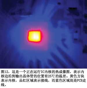 有關ESD二極管方法的另一個擔心是,IC芯片并不是等溫的,即它們在空間和時間上都不具備相等或恒定溫度。測量ESD二極管時并不能永遠保證測到的是內核的最熱點。這里關注的是ESD二極管,它總是在芯片的邊沿,低于輸出晶體管的溫度。你可以獲得IC工作時的IR熱成像圖(圖12)。圖中明亮的白點比ESD二極管所在的內核邊沿高25℃。當器件工作在高溫下時,可能需要降級使用(參考文獻8)。在150℃時,器件可能不能滿足電路的要求。