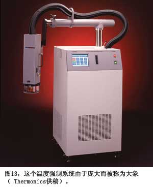 做測量只是檢查真實情況,驗證自己的假設與估算的一個部分。如果沒有可用的環境溫度,你還必須自己創造出來。汽車公司會在亞利桑那州和加拿大做跟蹤測試,對于電子測試,采用臺面測試室或溫度強制系統,如Thermonics的T-2500E型(圖13)。要確保使用的電纜和測試線可以承受熱量。BrownBNC電纜有較高的額定溫度,優于更常用的黑色U58型線(參考文獻9)。熱風槍的快速氣流就可以加熱IC,但要小心,IC可能很容易被熱風槍毀壞。制
