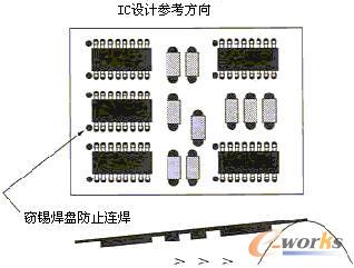 PCB上元器件的布局對生產效率和成本有相當重要的影響,是衡量PCB設計的可裝聯性的重要指標。一般來講,元器件盡可能均勻地、有規則地、整齊排列,并按相同方向、極性分布排列。有規則的排列方便檢查,有利于提高貼片/插件速度,均勻分布利于散熱和焊接工藝的優化。另一方面,為簡化工藝流程,PCB設計者始終都要清楚,在PCB的任一面,只能采用回流焊接和波峰焊接中的一種群焊工藝。這點在組裝密度較大、PCB的焊接面必須分布較多貼片元器件時,尤其值得注意。設計者要考慮對焊接面上的貼裝元件使用何種群焊工藝,最為優選的是使用貼片固化后的波峰焊工藝,可以同時對元件面上的穿孔器件的引腳進行焊接;但波峰焊接貼片元件有相對嚴格的約束,只能焊接0603及以上尺寸的片式阻容﹑SOT﹑SOIC(引腳間距≥1mm且高度小于2.0mm)。分布在焊接面的元器件,引腳的方向宜垂直于波峰焊接時PCB的傳送方向,以保證元器件兩邊的焊端或引線同時被浸焊,相鄰元件間的排列次序和間距也應滿足波峰焊接的要求以避免“遮蔽效應”,如圖1。當采用波峰焊接SOIC等多腳元件時,應于錫流方向最后兩個(每邊各1)焊腳處設置竊錫焊盤,防止連焊。