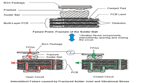 焊接球斷裂處定期的開開合合會導致間歇性電信號故障。震動,移動,溫度變化,或其他應力可以使斷裂的焊接球開開合合,從而導致電信號的間歇性故障。PCB廠使用的易彎曲的材料使這種間歇性信號也成為可能,例如震動應力造成的斷裂開開合合,難以預測的開開合合的焊接球電路導致間歇性信號,這種間歇性故障很難被診斷。另外,FPGA周圍的I/O緩沖電路使測量焊接網絡的電阻值幾乎不可能。在工作的FPGA中出現故障的器件可能會在測試床上沒有任何故障發現(NTF)就通過測試,因為焊接處暫時連接上了。很多用戶發現FPGA工作不正常,用手按一P下,FPGA就工作正常了,也是因為這個原因.