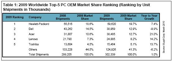 從2009年全年來看,五大PC OEM廠商中有四家增長率高于整體產業。最大廠商惠普增長7.4%。宏基、聯想和東芝分別排是第三、第四和第五大廠商,分別增長21%、14.2%和13.7%。排名第二的戴爾出貨量下降。