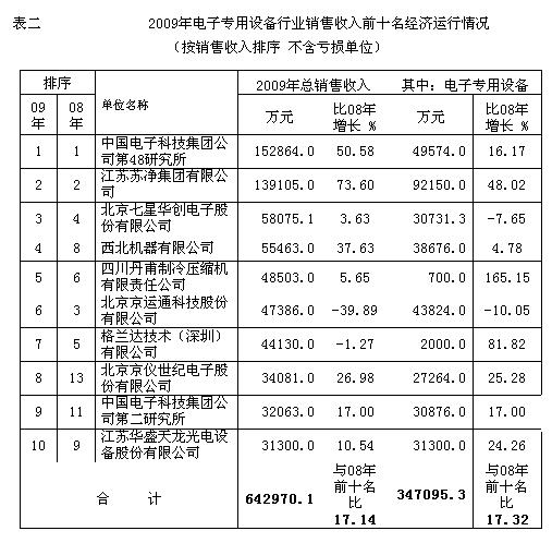 2009年電子專(zhuān)用設(shè)備行業(yè)前十名銷(xiāo)售收入總額達(dá)到64.3億元,占全行業(yè)銷(xiāo)售收入的69.9(2006年為61% 2007年為63.9% 2008年為66.5%),比2008年的前十名銷(xiāo)售收入增長(zhǎng)17.14%。入圍前十名的銷(xiāo)售收入也從2008年的2.82億元提高到2009年的3.13億元。中國(guó)電子科技集團(tuán)公司第四十八研究所,2009年在太陽(yáng)能設(shè)備和太陽(yáng)能電池片的推動(dòng)下得到了快速的發(fā)展,總銷(xiāo)售收入達(dá)到15.3億元,繼續(xù)位居行業(yè)的首位。