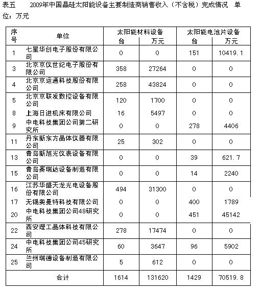 2009年下半年在光伏產(chǎn)業(yè)市場(chǎng)的推動(dòng)下,我國(guó)晶硅太陽(yáng)能設(shè)備得到迅速?gòu)?fù)蘇,2009年我國(guó)主要太陽(yáng)能電池制造商太陽(yáng)能設(shè)備銷(xiāo)售收入比2008年增長(zhǎng)了14.44%,達(dá)到20.21億元。其中:太陽(yáng)能級(jí)晶硅生長(zhǎng)和加工設(shè)備增長(zhǎng)7.34%,達(dá)到13.16億元,占太陽(yáng)能電池設(shè)備銷(xiāo)售收入的65.1﹪(2008年為69.4%);晶硅太陽(yáng)能電池芯片制造設(shè)備增長(zhǎng)30.56%,達(dá)到7.05億元,占太陽(yáng)能電池設(shè)備銷(xiāo)售收入的34.9﹪。