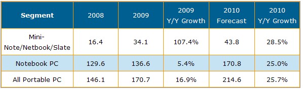 展望2010年筆記本電腦市場,出貨量將有強勁增長同時銷售價格降幅趨于緩和,使得便攜式電腦市場的營業(yè)額能達到1千170億美金,恢復(fù)到2008年的水平。上網(wǎng)本與平板電腦將是營收增長最高應(yīng)用別,主要是由于高單價產(chǎn)品的推出;不過上網(wǎng)本平均銷售價格將由2009年每臺400美元下滑到每臺300美元;而Apple iPad將是該應(yīng)用別主要出貨貢獻,平均單價從入門機種每臺499美金到高階機種超過每臺800美金之上都有。