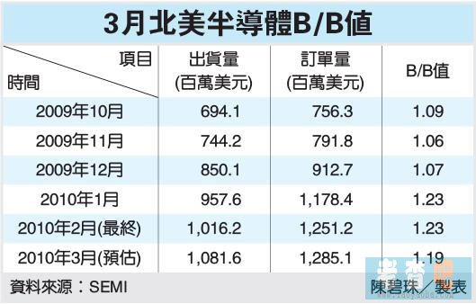 國(guó)際半導(dǎo)體設(shè)備材料產(chǎn)業(yè)協(xié)會(huì)(SEMI)公布,3月最新北美半導(dǎo)體訂單出貨比(Book-to-Bill)為1.19,較2月修正后的1.23略為下降,仍是連續(xù)第九個(gè)月超過1以上的紀(jì)錄,加上絕對(duì)訂單,與出貨金額各創(chuàng)30個(gè)月與20個(gè)月新高,顯示半導(dǎo)體景氣仍在多頭。