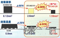 后者的封裝采用了兩項扁平化技術(shù)。一是改變了焊錫球的形狀。從原來的球狀改為了半球狀,高度降低了120μm。第二項是封裝背面的保護(hù)膜技術(shù)。將Si部分的高度比原產(chǎn)品降低80μm,并為確保強(qiáng)度而在背面粘貼了20μm的保護(hù)膜。這減少了60μm的高度。兩項技術(shù)加起來,此次將高度從已有的EFC4601R的550μm降低了33%至370μm。
