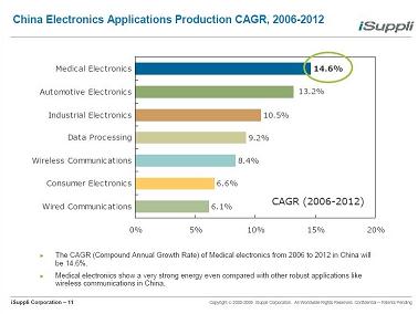 “醫療電子市場的年復合增長率在所在領域中最高,達14.6%,超過目前也是很火的汽車電子、無線通信等領域,所以大家可以想象它為什么吸引眾多觀眾。”iSuppli資深分析師王仁震解釋,“而中國醫療電子市場占全球的比例也是逐年增長,2006年只占到4%,但2013年可達到9%的比重。”