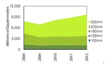 全球硅片市場按出貨面積計, 在2009年下降11%, 而在2010年有望達(dá)到82億百萬平方英寸, 增長17%。其中300mm硅片增長最快為27%,達(dá)45億百萬平方英寸(MSI), 相比較200mm硅片增長7%及150mm硅片在10%以下。